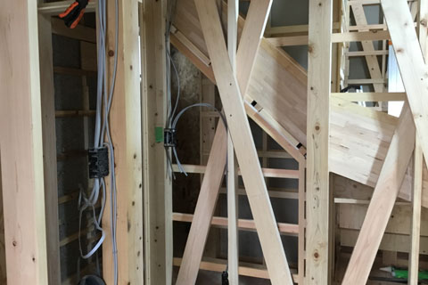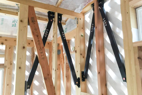 地震による倒壊や台風によって屋根が飛ぶなどの被害を抑え、建築時の高性能を長期間にわたり維持します。梁成240mm以上は赤松の集成材を使い、それ以外は県産材の杉・桧を使います。筋かいは無垢の桧を使いますが、無垢材はどうしても強度のばらつきがあるので、一般的な物よりも幅の広い105mmの物を使います。